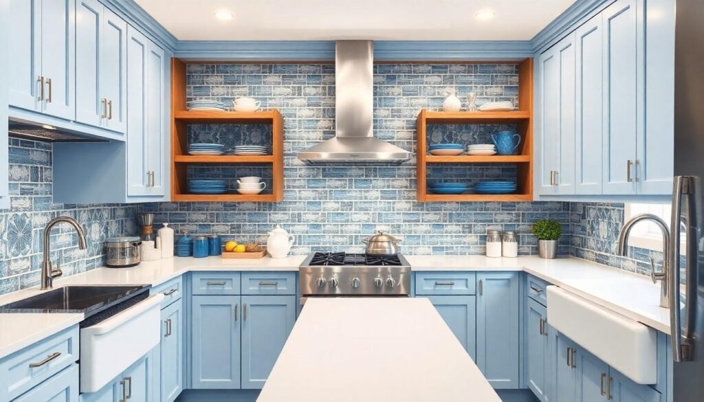 Trendy yet practical design elements contribute to the overall functionality. Open shelving in blue or white provides a stylish way to display dishware while keeping items easily accessible. Furthermore, the combination works well across various kitchen styles, including coastal, farmhouse, and contemporary designs.